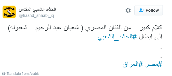 أثارت أغنية للمطرب الشعبي “شعبان عبد الرحيم”، يدعم فيها “الحشد الشعبي” الشيعي العراقي بسبب مشاركته في معركة الموصل، استياء عدد من النشطاء على مواقع التواصل الاجتماعي.