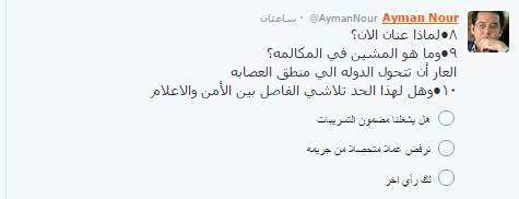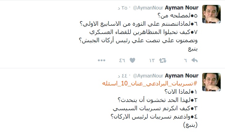 طرح أيمن نور مؤسس حزب غد الثورة، 10 أسئلة بشأن تسريب المكالمات الهاتفية بين محمد البرادعي نائب رئيس الجمهورية السابق، والفريق سامي عنان رئيس أركان حرب القوات المسلحة السابق، في هذا التوقيت.