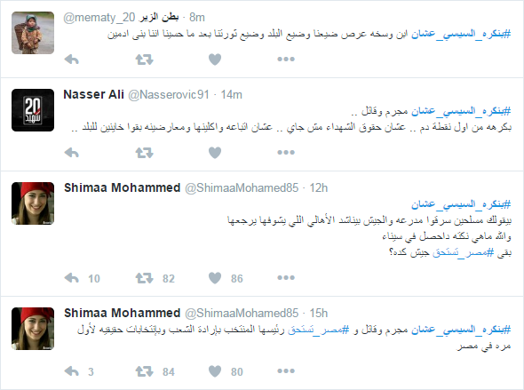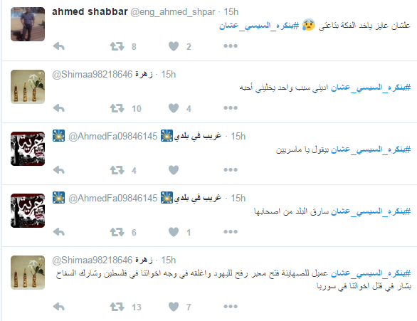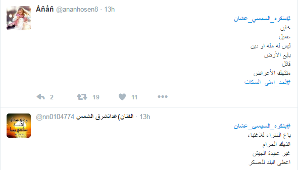 وعدد المغردون أسباب كراهيتهم للسيسي، مؤكدين أنه باع البلد ووصفوه بالمجرم العميل، بالإضافة إلى زيادة أسعار السلع واللحوم وأزمة الدواء.