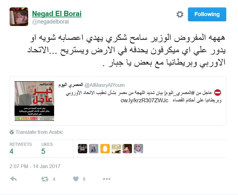 وقال البرعي في تغريدة عبر حسابه على موقع التدوين المصغر “تويتر”: “هههه المفروض الوزير سامح شكري يهدي أعصابه شوية أو يدور على أي ميكرفون يحدفه في الأرض ويستريح، الاتحاد الأوربي وبريطانيا مع بعض يا جبار”.