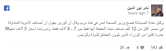 وأضاف نادر نور الدين خلال منشور له عبر صفحته الشخصية بموقع التواصل الاجتماعي “فيسبوك”: “الوزير بيقول إن أصناف الأدوية المتداولة في مصر أكثر من 12 ألف صنف، بينما الحقيقة أنها فقط بين 7 – 8 آلاف فقط، وتم زيادة أسعار 3 آلاف منها”!!!.
