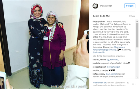 ونشرت لوهان عقب الزيارة  قصيدة مؤثرة للغاية، عبر حسابها الرسمي على “إنستجرام”، وكتبت: “قابلت واحدة من النساء الرائعات اللائي يعملن في الإغاثة بمعسكر عنتاب للاجئين السوريين على الحدود التركية، اسمها عزيزة، وقد رأيت كيف أن عينيها ومضتا بشدة عندما أخبرتها أن غطاء الرأس الذي تلبسه جميل”.