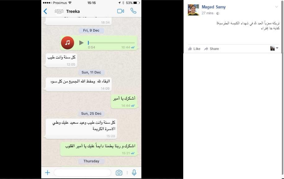 ووضع “سامي”، عبر حسابه الشخصي على موقع التواصل الاجتماعي “فيس بوك”، محادثة كانت بينه وبين اللاعب محمد تريكة، عبر تطبيق “واتس آب” الشهير، أرسل فيها أبو تريكة تعازيه في متوفي الكنيسة البطرسية، في ديسمبر الماضي.