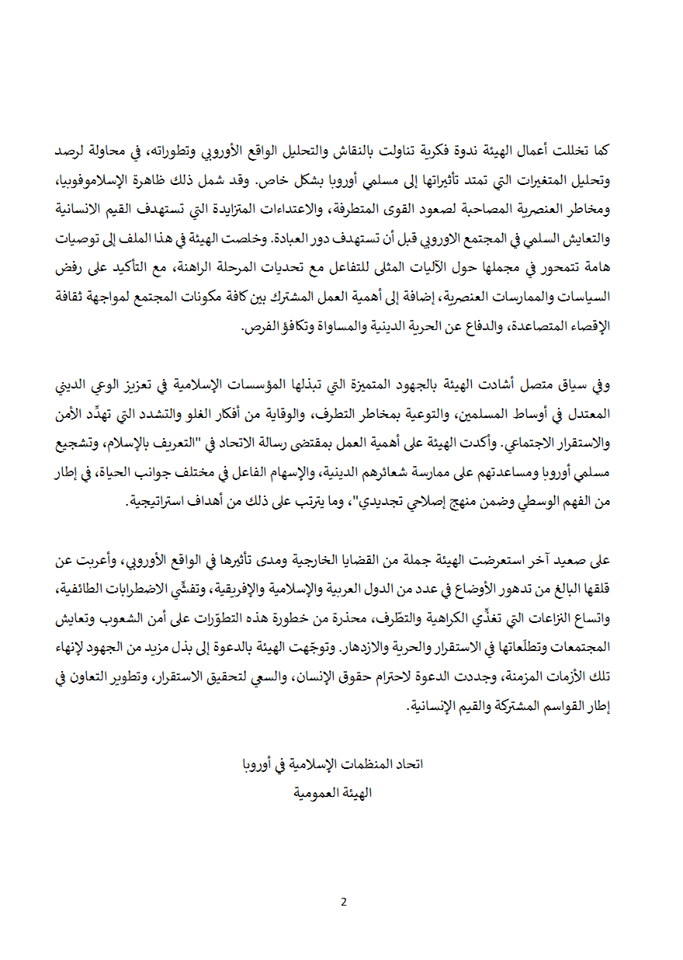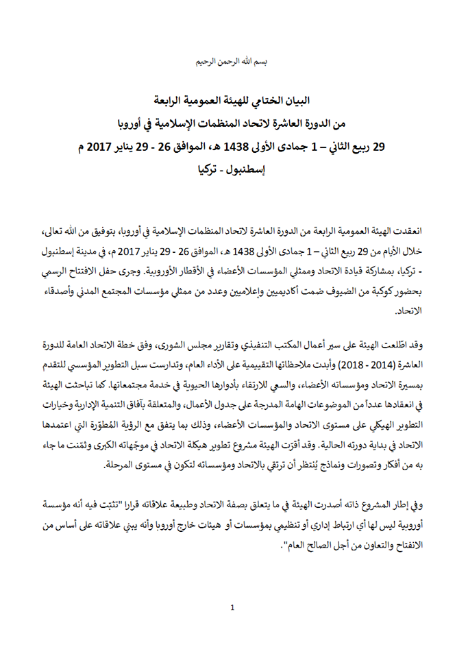جدير بالذكر أن “اتحاد المنظمات الإسلامية في أوروبا”، هي هيئة إسلامية أوروبية جامعة تشكل إطارًا موحدًا للمنظمات والمؤسسات والجمعيات الإسلامية الأوروبية، وتضم هيئات ومؤسسات ومراكز في 30 دولة أوروبية، ويعتبر اتحاد المنظمات الإسلامية في أوروبا الجناح الأوروبي لتيار الإخوان المسلمين العالمي، وفاز برئاسته مؤخرًا القيادى “عبد الله بن منصور” خلال الانتخابات التي أجريت في تركيا خلال الفترة من 6 فبراير في 2014م.
