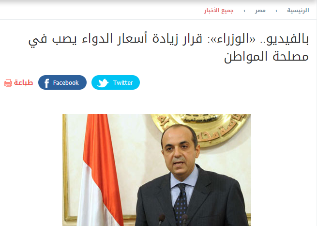 وسبق وصرح المتحدث باسم رئاسة الوزراء بأن زيادة أسعار الدواء المصري الأقل من 30 جنيهًا تصب في صالح المواطن المصري أولًا، موضحًا أن هذا القرار سيحمس شركات الأدوية على تصنيع هذه العقاقير وتوفيرها للمواطن؛ إلا أن الشعب فوجئ بنقص الدواء وزيادة أسعاره بشكل جنوني، وهو ما أدى إلى ارتفاع الأصوات المطالبة بإقالة وزير الصحة.