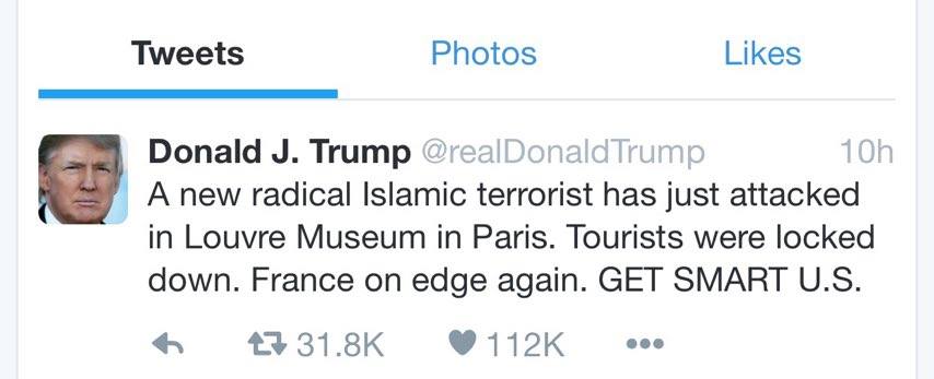 علق الرئيس الأمريكي دونالد ترمب على الهجوم الذي وقع الجمعة على جنود فرنسيين أمام متحف اللوفر فور وقوعه وقبل الإعلان عن هوية المنفذ، فقال في موقع تويتر: “إرهابي إسلامي متطرف جديد هاجم للتو متحف اللوفر في باريس. السياح تمت محاصرتهم. فرنسا على الحافة مجددًا. كوني ذكية يا أمريكا”.