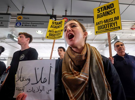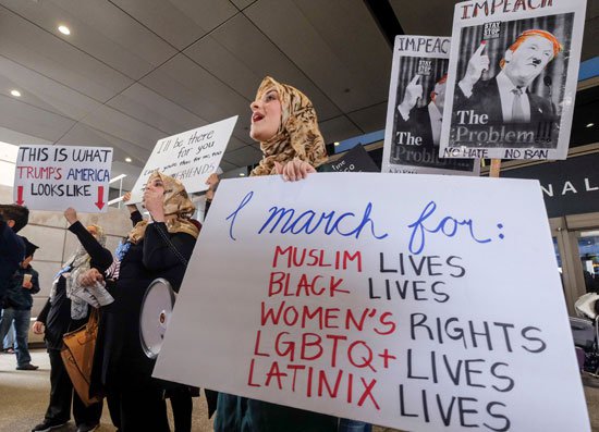 ورفع العشرات من الامريكيين ، لافتات مؤيدة للمسلمين، ومنددة بقرارات ترامب العنصرية.