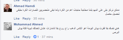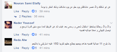 وجاءت تعليقات الرواد على المنشور منتقدة اتصال السيسي باللاعبين قبل المباراة، متشائمين من تدخله في الرياضة؛ خاصة هذه المباراة، مؤكدين أن الإعلام كان سينسب الفوز إلى السيسي.
