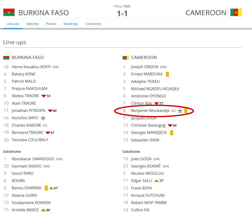 صورة من موقع “فيفا” تؤكد حصول اللاعب على إنذار من مباراة الكاميرون وبوركينا فاسو:
