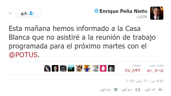 ودعا رفض المكسيك تصريحات ترامب بإلزمهم بدفع التكاليف، إلى إلغاء الزيارة التي كانت مقررة في 31 يناير، من ” بينا نييتو” إلى الولايات المتحدة الاميركية، بعد أن كتب ترامب على صفحته الشخصية على موقع “تويتر” : “إذا كانت المكسيك غير مستعدة لدفع ثمن الجدار، فإنه سيكون من الأفضل أن تلغى اللقاء المرتقب بيننا”.