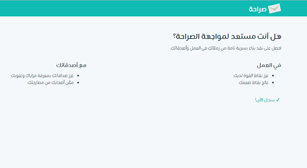 يتيح موقع “صراحة” لأصدقائك أن يقولوا رأيهم في شخصك بـ”صراحة”، دون أن يظهر لك اسم أي منهم؛ وبمعنى أكثر دقة، يعد الهدف الأساسي من الموقع -كما كُتب على الحساب الرسمي له على موقع التغريدات القصيرة “تويتر”- هو “موقع يساعدك في التعرف على عيوبك ومزاياك عن طريق الحصول على نقد من موظفيك وأصدقائك بسرية تامة دون معرفة المرسِل”.