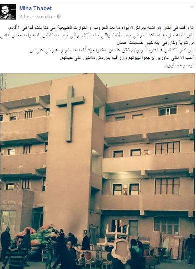 ويقول مينا ثابت، أحد نشطاء الأقباط: “أنا واقف في مكان أشبه بمراكز الإيواء ما بعد الحروب أو الكوارث الطبيعية اللي كنا بنشوفها في الأفلام، ناس داخلة خارجة بمساعدات، واللي جايب أثاث واللي جايب أكل، واللي جايب بطاطين، لسه واحد معدّي قدامي من شوية وكان في إيده كيس حسابات أطفال!”.