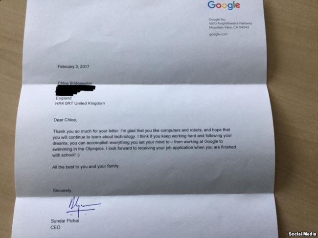 ولم يتوقع والد كلوي أن يصل ابنته، رد من مدير شركة جوجل  سوندار بيشاي يشكرها على اهتمامها بالتكنولوجيا والروبوتات.