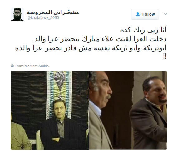 واعتبر “إسماعيل” المشهد تلخيصًا لحال مصر: “حالنا بعد الثورة اتلخص في مشهد النهارده: علاء مبارك بيحضر عزا والد أبو تريكة، في نفس الوقت اللي فيه أبو تريكة نفسه مش عارف يحضر عزا أبوه”، فيما لفت “نادر” إلى شيء آخر: “ناهيا اللي الداخلية والجيش بيحاصروها كل شوية ويقتلوا ويعتقلوا أهلها بحجة إنها مليانة إرهابيين! علاء مبارك دخلها وخرج من غير ما يحصل له حاجة”.