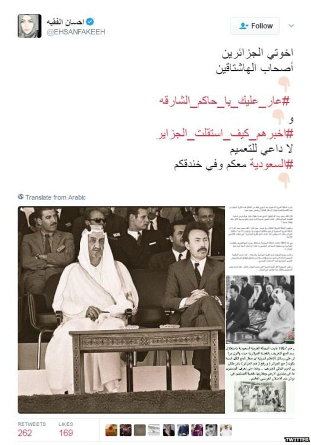 التصريحات التي أدلى بها الحاكم الإمراتي قبل أيام لا تزال تلقى صدى على مواقع التواصل الاجتماعي؛ حيث أطلق المغردون هاشتاجي “#اخبرهم_كيف_استقلت_الجزاير” و”#عار_عليك_يا_حاكم_الشارقة”، وظهرا في حوالي 1860 تغريدة ندد معظمها بتصريحات القاسمي.