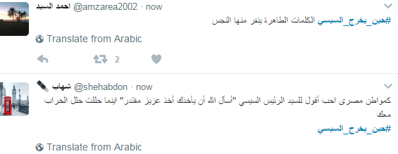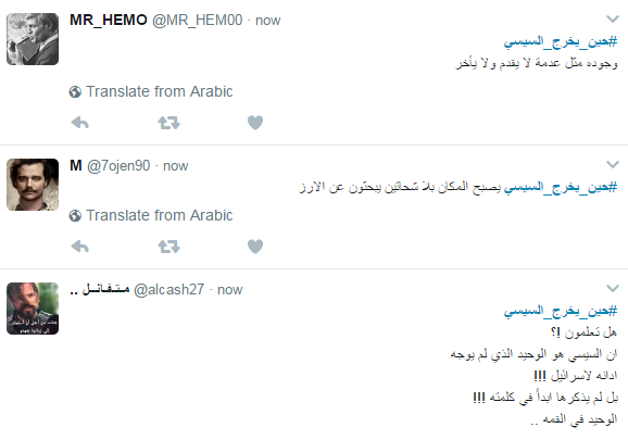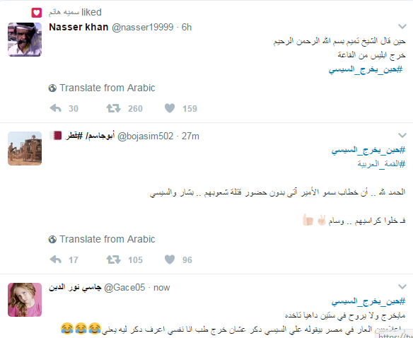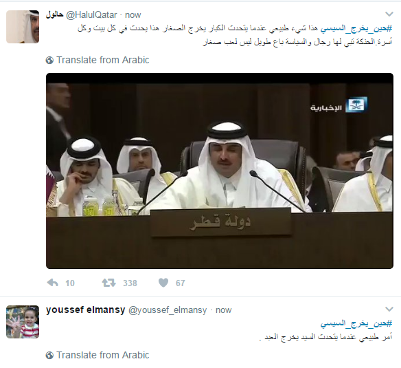 واعتبر المغردون خلال هاشتاج “#حين_يخرج_السيسي” أن أمير قطر لقّن السيسي درسًا في كلمته حول كيفية عدم الخلط بين التنظيمات السياسية السلمية (في تلميح واضح إلى جماعة الإخوان المسلمين) والأخرى التي تلجأ إلى ممارسة العنف.