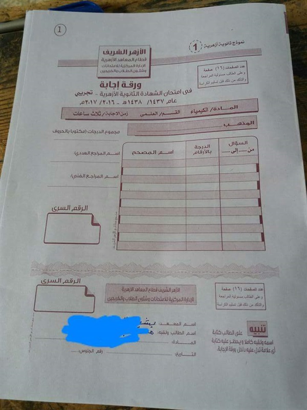 تداول رواد موقع التواصل الاجتماعي "فيس بوك" صور ورقة الامتحان التجريبي على نظام "البوكليت"، لمادة الكيمياء والجبر لطلاب القسم العلمي بالثانوية الأزهرية.