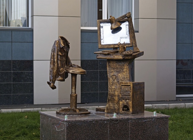 نصب تذكاري اخصائي كمبيوتر في مكان عمله يتكون من: كرسي، طاولة، كمبيوتر، مكتب مسلط عليه الضوء وحتى سترة تم منحوتة ولكن الاخصائي نفسه مفقود!