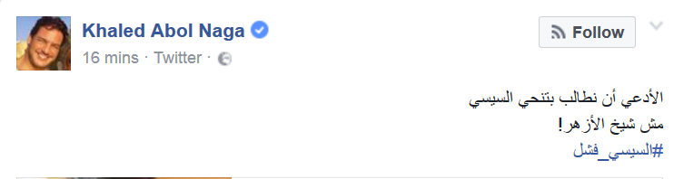 وقال في تدوينة عبر حسابه الرسمي على موقع التواصل الاجتماعي “فيس بوك”: “الأدعى أن نطالب بتنحي السيسي، مش شيخ الأزهر، السيسي فشل”.