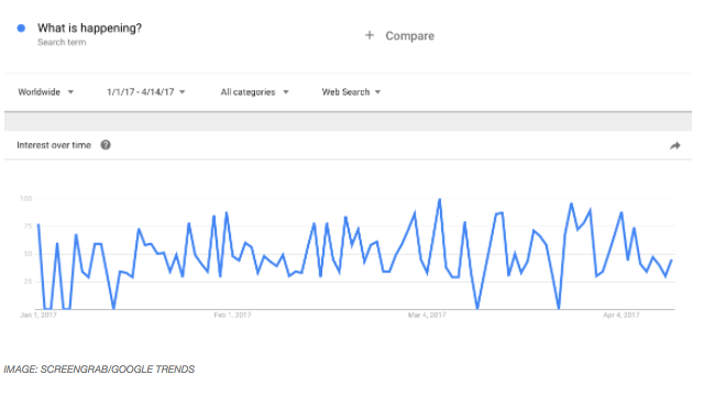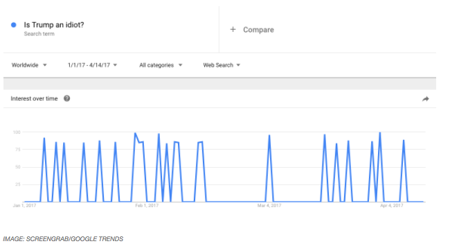 ويبدو أن العديد يهتم بوضع الحرب في العالم اليوم مما أدى لظهور تساؤلات مرتبطة بالوضع من خلال محرك البحث جوجل مثل ” هل ترامب أحمق ؟ ” و ” ما الذي يحدث ؟ ” وهو ما يظهر أن العالم أصبح في حالة ارتباك منذ أن تسلم ترامب رئاسة الولايات المتحدة الأمريكية.