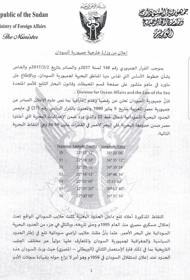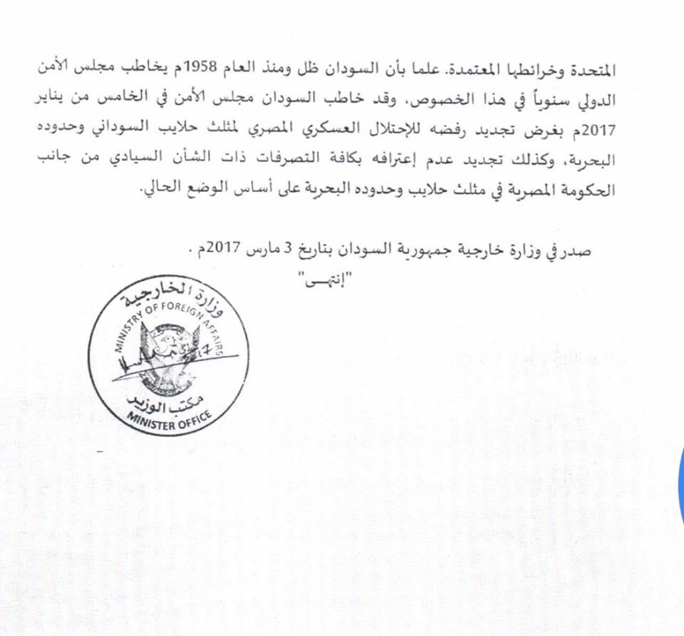 قالت وزارة الخارجية السودانية في خطاب رسمي موجه للأمم المتحدة إنها ترفض القرار المصري رقم 27 الصادر في 9 يناير 1990 المتعلق بسيادة مصر على مثلث حلايب وشلاتين الواقع على الحدود بين مصر والسودان.