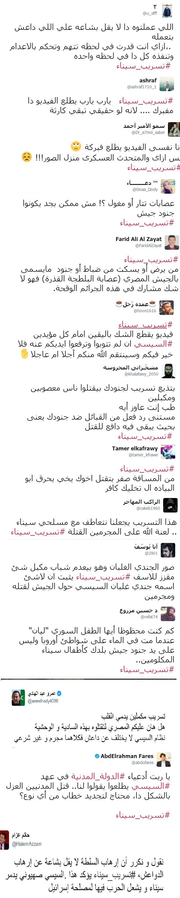 من جانبهم، دشّن المغردون عبر موقع التواصل الاجتماعي “تويتر” وسم “تسريب سيناء”، تصدّر قائمة “الأعلى تداولًا”؛ مستنكرين الواقعة، ومتسائلين: ما الفرق بين “قوات الجيش” وتنظيم ولاية سيناء؟