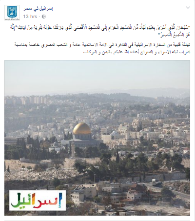 وقالت السفارة عبر صفحتها الرسمية على “فيس بوك”: “تهنئة قلبية من السفارة الإسرائيلية في القاهرة إلى الأمة الإسلامية عامة والشعب المصري خاصة بمناسبة اقتراب ليلة الاسراء والمعراج. أعاده الله عليكم باليمن والبركات”.