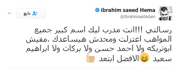 وقال إبراهيم: “رسالتي، أنت مدرب ليك اسم كبير، جميع المواهب اعتزلت ومحدش هيساعدك. مفيش أبو تريكة ولا أحمد حسن ولا بركات ولا إبراهيم سعيد. الأفضل ابتعد”.