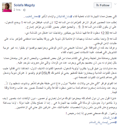 ووصفت “سولفا” المعاملة التي تعرض إليها الإعلاميون بـ”السيئة”، وقالت في منشور عبر صفحتها بموقع التواصل الاجتماعي “فيس بوك”: “إطّلب مننا الحضور لمركز الأزهر للمؤتمرات من الساعه 12 لأن الباب هيتقفل من الساعة 1 ويمنع الدخول، على أن يكون اللقاء من الساعه 3-5، والجميع هيقدر يصور اللقاء زي مؤتمر إمبارح (مؤتمر الشباب)”.