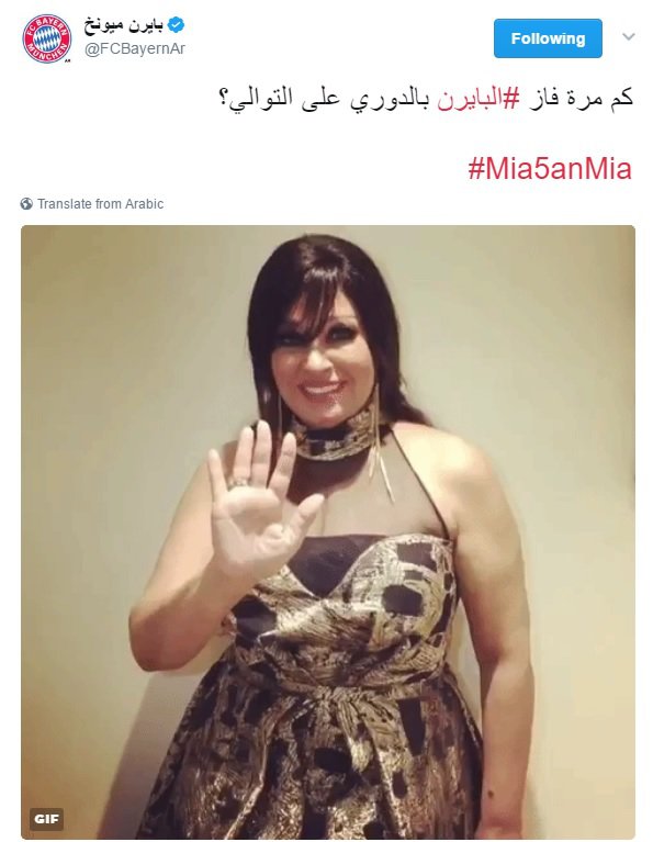 واستعان الحساب الناطق باللغة العربية على موقع “تويتر”، بصورة تظهر فيها الراقصة وهي تقول جملتها الشهيرة ” 5 مواااااه”، ليسبقها تساؤل عن عدد المرات التي توج الفريق الألماني بلقب الدوي الألماني على التوالي.