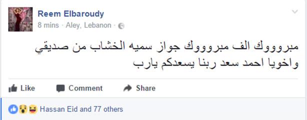 وهنّأت ريم العروسين قائلة: “مبروك، ألف مبروك جواز سمية الخشاب من صديقي وأخويا أحمد سعد، ربنا يسعدكم يارب”.