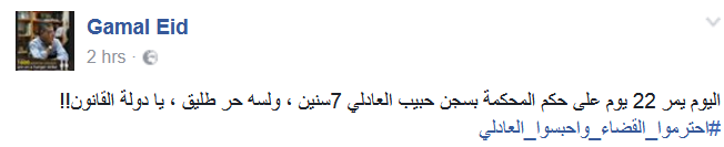وكتب عبر صفحته الشخصية بموقع التواصل الاجتماعي”فيس بوك”: “اليوم يمر 22 يوم على حكم المحكمة بسجن حبيب العادلي 7سنين ، ولسه حر طليق ، يا دولة القانون!! #احترموا_القضاء_واحبسوا_العادلي
