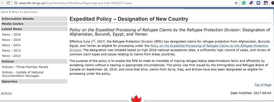 أعلنت الحكومة الكندية موافقتها على إدراج مصر ضمن القوائم المطلوب تسريع الموافقة على طلبات اللجوء لمواطنيها، مساواة في ذلك بدول أخرى مثل سوريا واليمن والعراق ودول الحروب؛ على أن يدخل القرار حيز التنفيذ في الأول من يونيو المقبل.