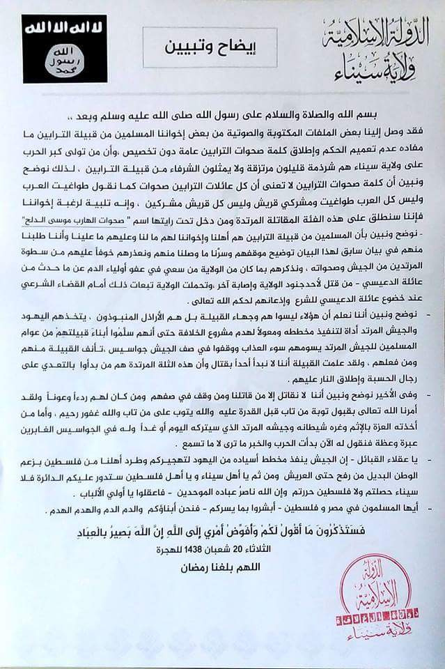 نصب مسلحون يعتقد انتمائهم لتنظيم ولاية سيناء كمين لهم جنوب رفح شمال سيناء، ووزعو بيان بعنوان “إيضاح وتبيين”، موجه لقبيلة الترابين خاصة، وقبائل سيناء في المناطق الحدوديه بشكل عام، ويحذرونهم من مخطط صهيوني يهدف لإقامة وطن بديل للفلسطينيين من رفح حتى العريش.