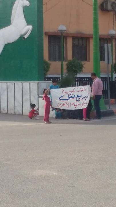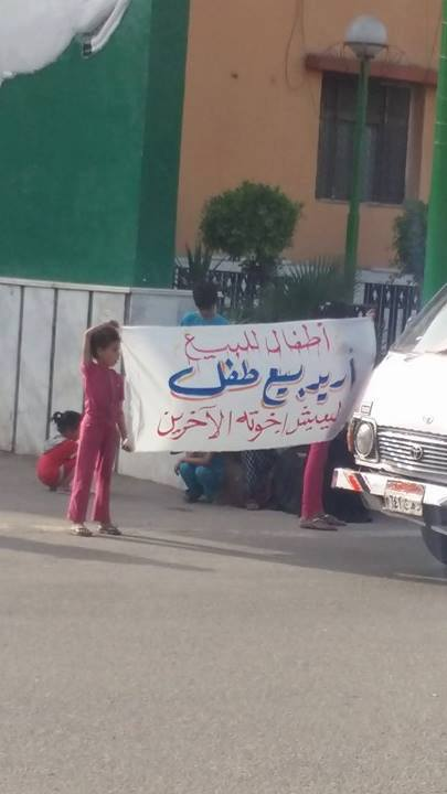 في مشهد مأساوي أمام مبنى محافظة الشرقية بمدينة الزقازيق، شوهدت سيدة مصطحبة أطفالها وجالسة بجوار لافتة مكتوب عليها "أطفال للبيع.. أريد بيع طفل ليعيش إخوته الآخرون".