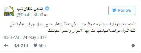 وفي الثاني والعشرين من الشهر الجاري ألمح الفريق ضاحي خلفان، نائب رئيس شرطة دبي، إلى خروج قطر عن مسار دول خليجية تؤيد قمة دونالد ترامب ومساعيهم لتوسيع نشاط مكافحة ما يسمى “الإرهاب”.