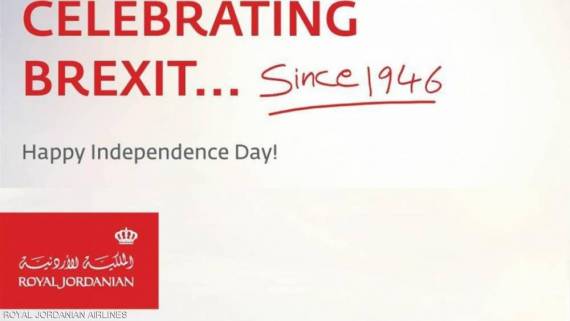 وقالت الشركة إن الأردنيين يحتفلون بخروج بريطانيا منذ 1946 “Celebrating BREXIT .. since 1946“، بحسب ما ذكرت سكاي نيوز.