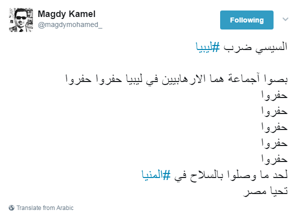 تفاعل مغردو موقع التدوين العالمي”تويتر” مع تنفيذ القوات الجوية المصرية ست ضربات على مواقع لمجلس شورى المجاهدين في درنة تحت مزاعم محاربة “الإرهاب” والرد على حادث الهجوم على حافلتين للأقباط في محافظة المنيا، الذي أسفر عن مقتل 28 قبطيًا وإصابة 25 آخرين، بحسب وزارة الصحة.