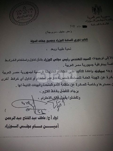 ونقل التعميم عن المهندس شريف إسماعيل، رئيس الوزراء، تأكيده استخدام الخرائط الرسمية لجمهورية مصر العربية الصادرة عن هيئة المساحة المصرية وعدم استخدام أي خرائط أخرى.