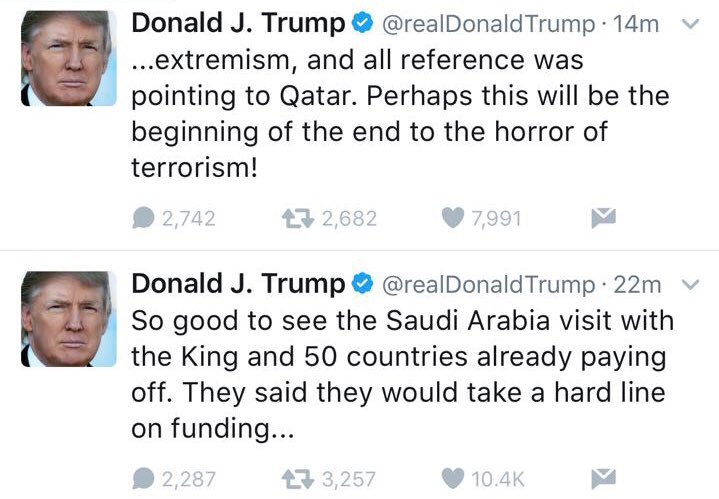 غرّد ترامب عبر تويتر قائلًا: “من الجيد للغاية أن نشهد ما تم في زيارة السعودية بحضور الملك و50 قائداً آخر. لقد قالوا إنهم سيتخذون نهجاً متشدداً ضد تمويل التطرف، وكانت كل الإشارات تشير نحو قطر.
