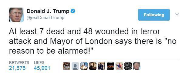 تغريدة لترامب على تويتر يهاجم فيها عمدة لندن عقب الهجوم الذي شهدته بلاده مؤخرا وراح ضحيته سبعة قتلى