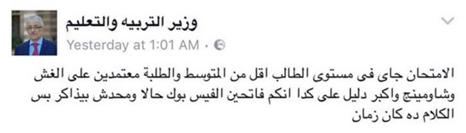 وبخصوص أزمة امتحان اللغة الإنجليزية، وشكوى الطلاب من صعوبته نشرت الصفحة المزيفة تصريحا أكد فيه أن “أي سؤال او نقطة ما كانتش موجودة عندكم في المنهج هايتم حذفها من الامتحان وهايتم توزيع درجاته على باقي الامتحان والمسئول اللى حط الامتحان سيتم معاقبته وسيتم اعادة الامتحان اذا لزم الامر”.