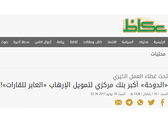 ونشرت عكاظ تقريرا عبر موقعها، اعتبرت فيه أن قطر أكبر بنك مركزي لتمويل الإرهاب “العابر للقارات”، مشيرة إلى استغلالها المنظمات الخيرية من أجل تمويل الإرهاب كغطاء.