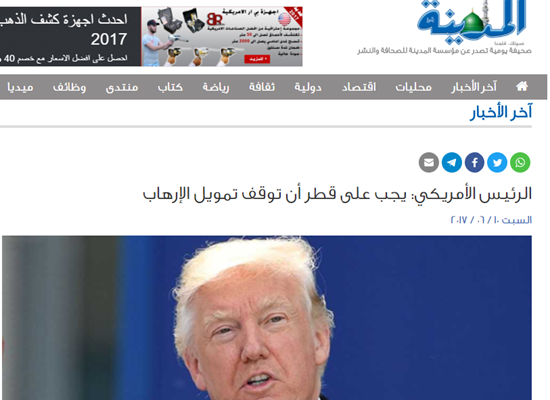 كما لفتت صحيفة المدينة، إلى تصريحات ترامب التي قال فيها “يجب على قطر أن توقف تمويل الإرهاب”.