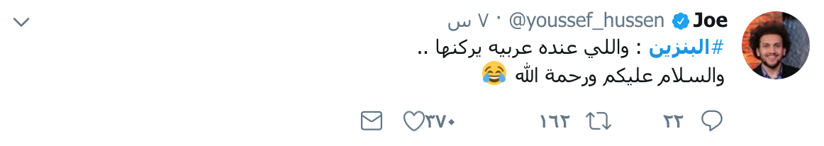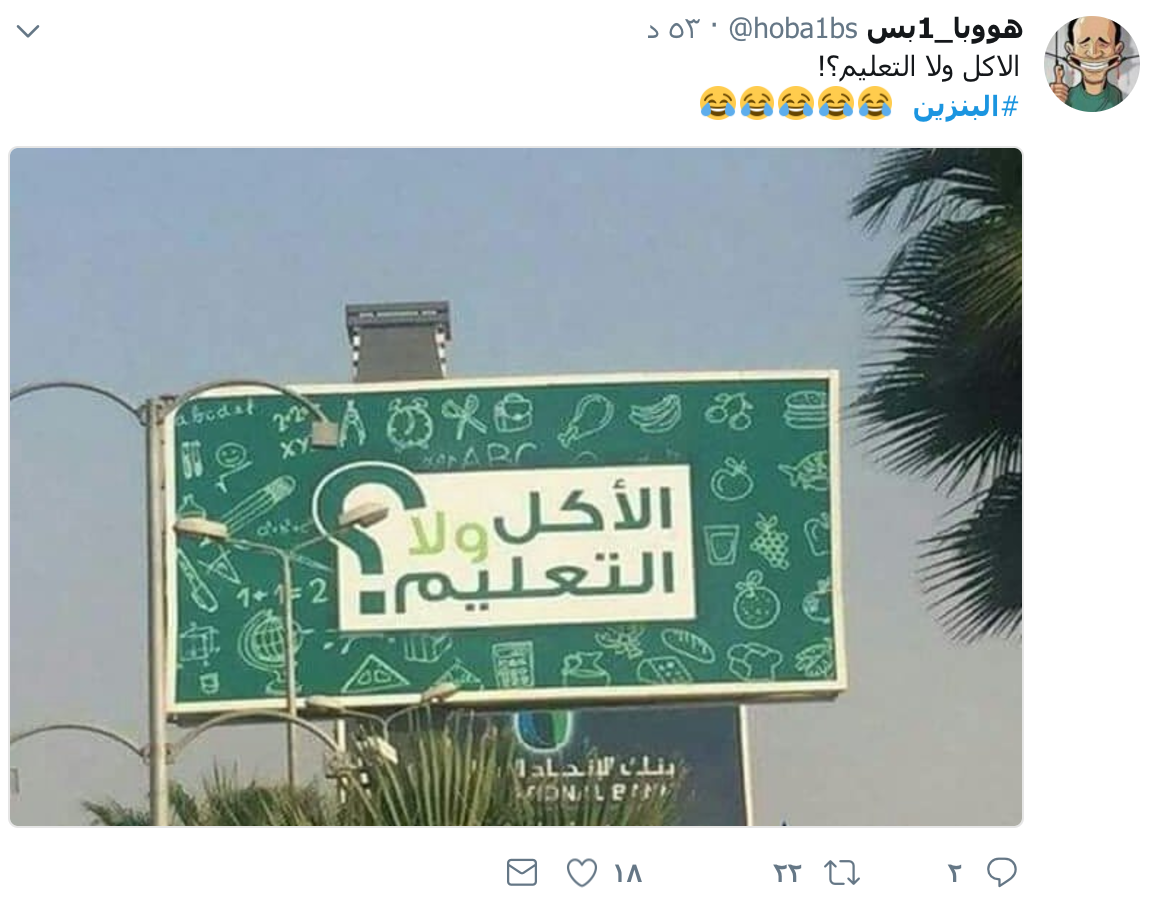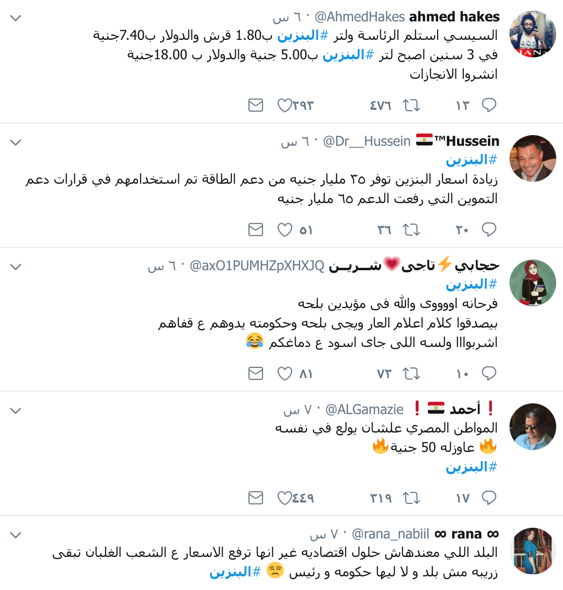 وتصدّر هاشتاج «#البنزين» المركز الأول في قائمة الأكثر تداولًا على موقع التواصل الاجتماعي «تويتر»، وكعادة الشعب المصري في السخرية من الأزمات التي يمر بها كانت معظم الآراء تدور في إطار «الكوميديا السوداء»؛ نستعرض بعضًا منها في التالي: