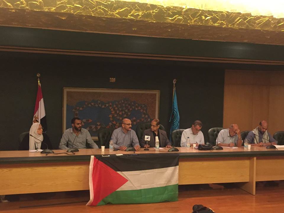 حاضر في الندوة، المقامة في الطابق الثالث بالنقابة، الكاتب والمؤرخ الفلسطيني الدكتور عبدالقادر ياسين، والباحثة في الآثار المعمارية الدكتورة ناجية عبدالمغني، ومنسق حركة المقاطعة الدولية رامي شعث.