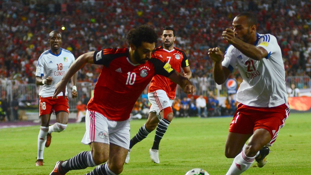 محمد صلاح في كرة تسجيل الهدف الأول في مرمى الكونغو