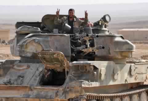 جندي من القوات السورية يرفع علامة النصر في مدينة دير الزور