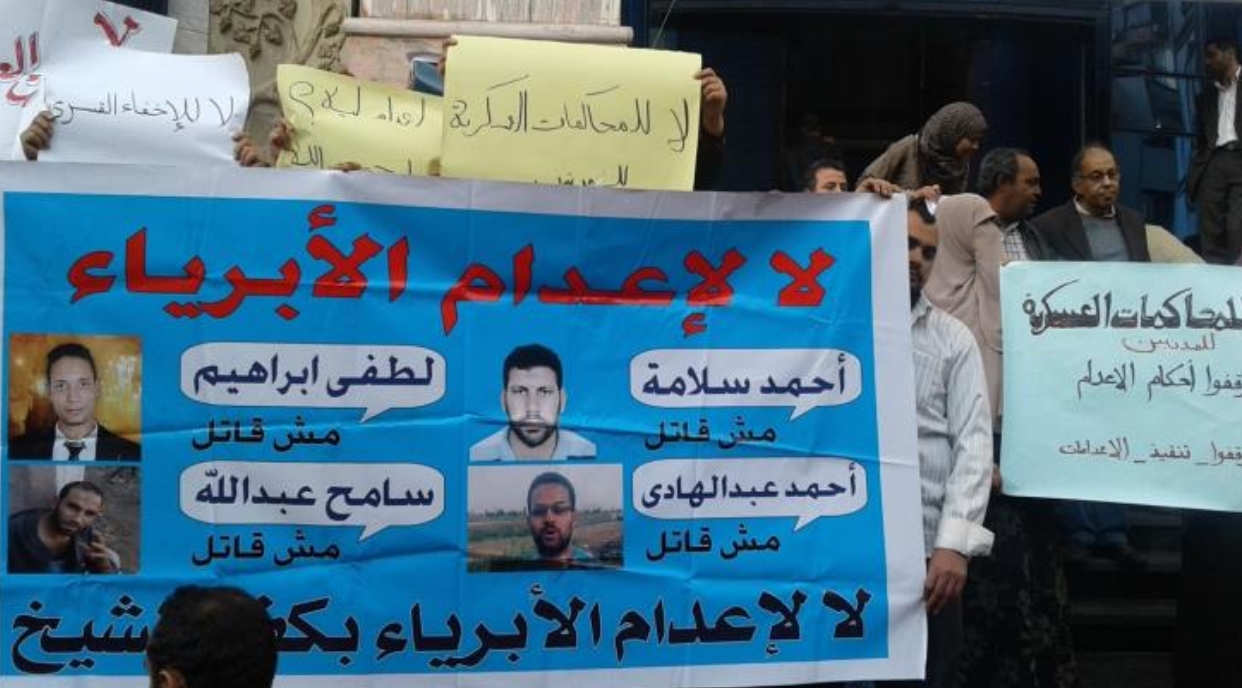 وكان المحامي في القضية المعروفة إعلاميا بـ«استاد كفر الشيخ» أسامة بيومي، صرح، أمس، أنه تم إخطاره لتنفيذ حكم الإعدام، فجر الثلاثاء، بسجن برج العرب، في 4 مواطنين أدينوا في محاكمة عسكرية، بعد رفض طعونهم في الحكم الصادر بحقهم.