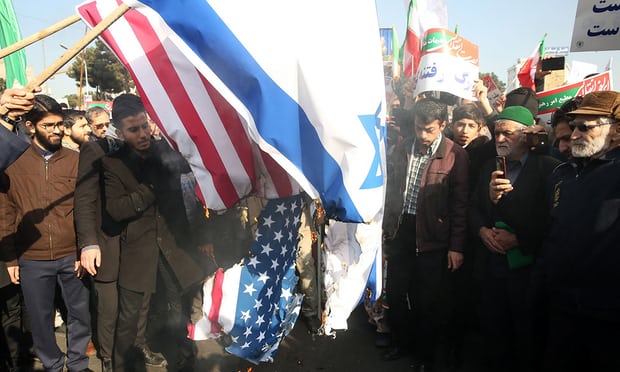 متظاهرون إيرانيون يحرقون علمي أميركا و«إسرائيل» أثناء مظاهرة مؤيدة للحكومة في مدينة «مشهد» في يناير 2018. تصوير: نعمة نجف زاده (EPA)